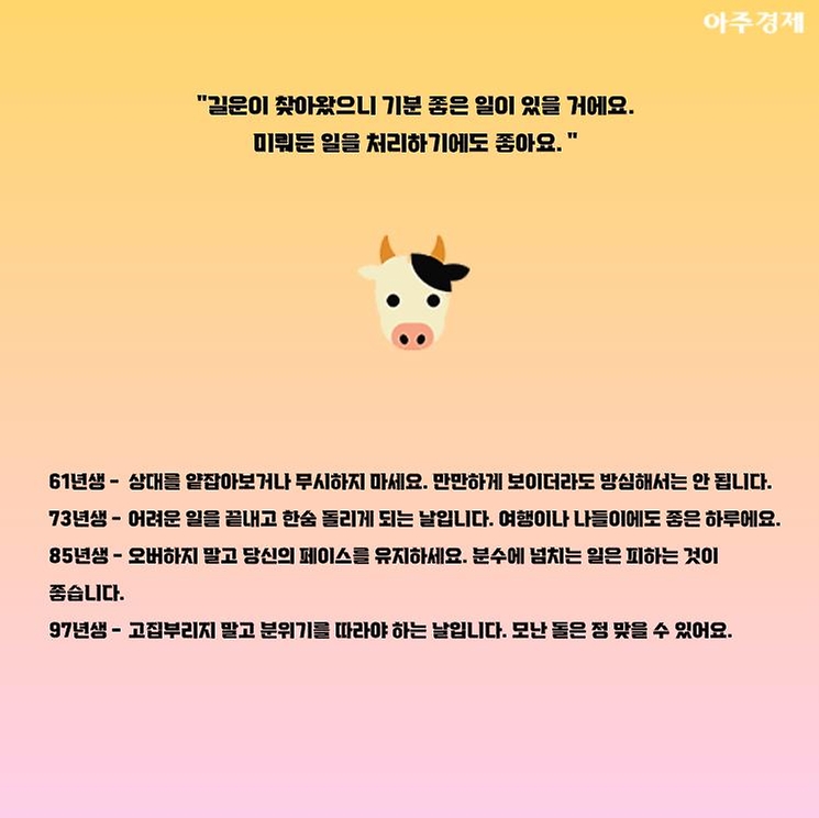 ▶소띠 오늘의 운세 "길운이 찾아왔으니 기분 좋은 일이 있을 거에요. 미뤄둔 일을 처리하기에도 좋아요. "