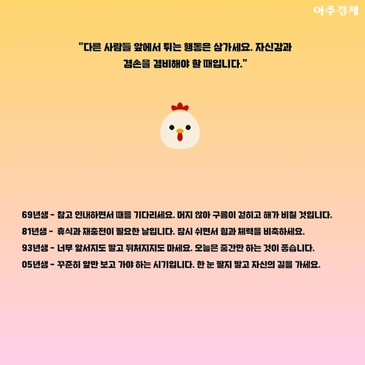 ▶닭띠 오늘의 운세 "다른 사람들 앞에서 튀는 행동은 삼가세요. 자신감과 겸손을 겸비해야 할 때입니다."