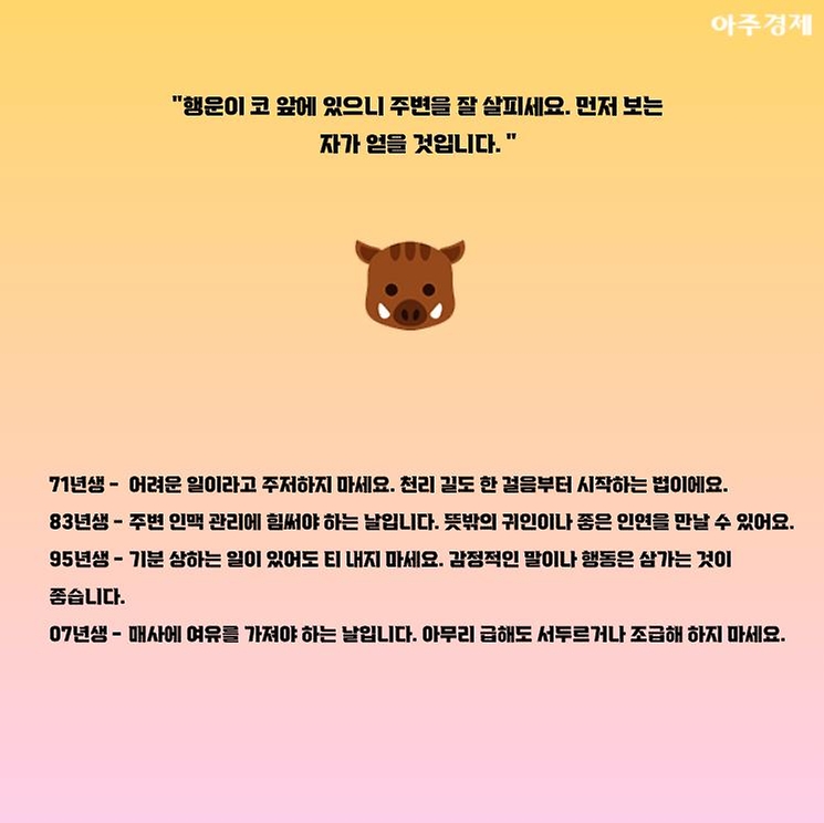 ▶돼지띠 오늘의 운세 "행운이 코 앞에 있으니 주변을 잘 살피세요. 먼저 보는 자가 얻을 것입니다. "