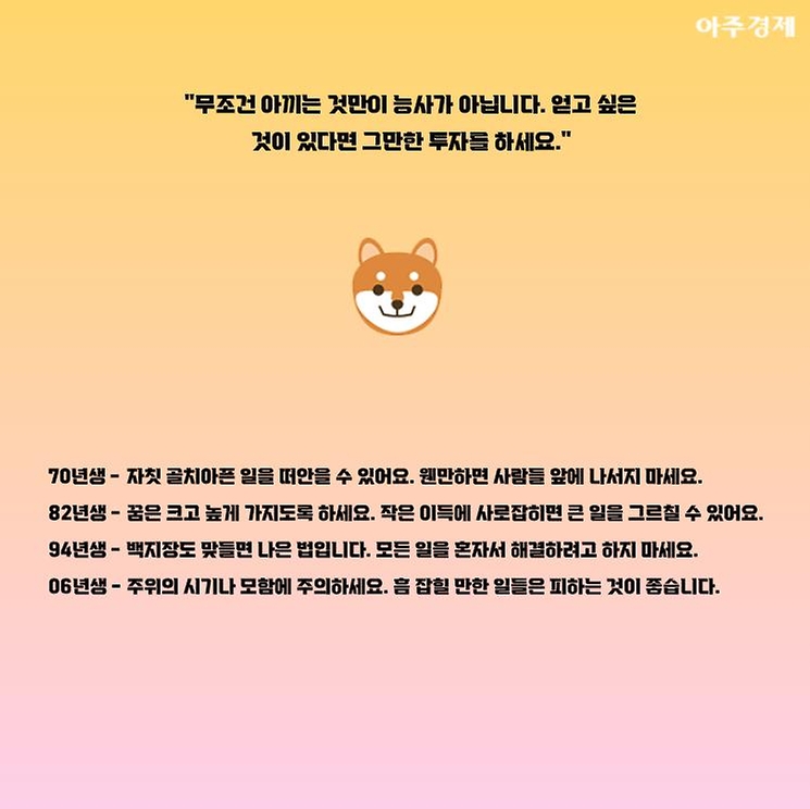 ▶개띠 오늘의 운세 "무조건 아끼는 것만이 능사가 아닙니다. 얻고 싶은 것이 있다면 그만한 투자를 하세요."