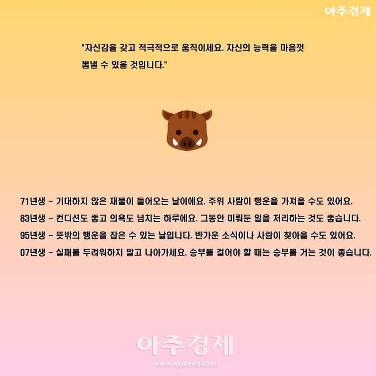 ▶돼지띠 오늘의 운세 "자신감을 갖고 적극적으로 움직이세요. 자신의 능력을 마음껏 뽐낼 수 있을 것입니다."