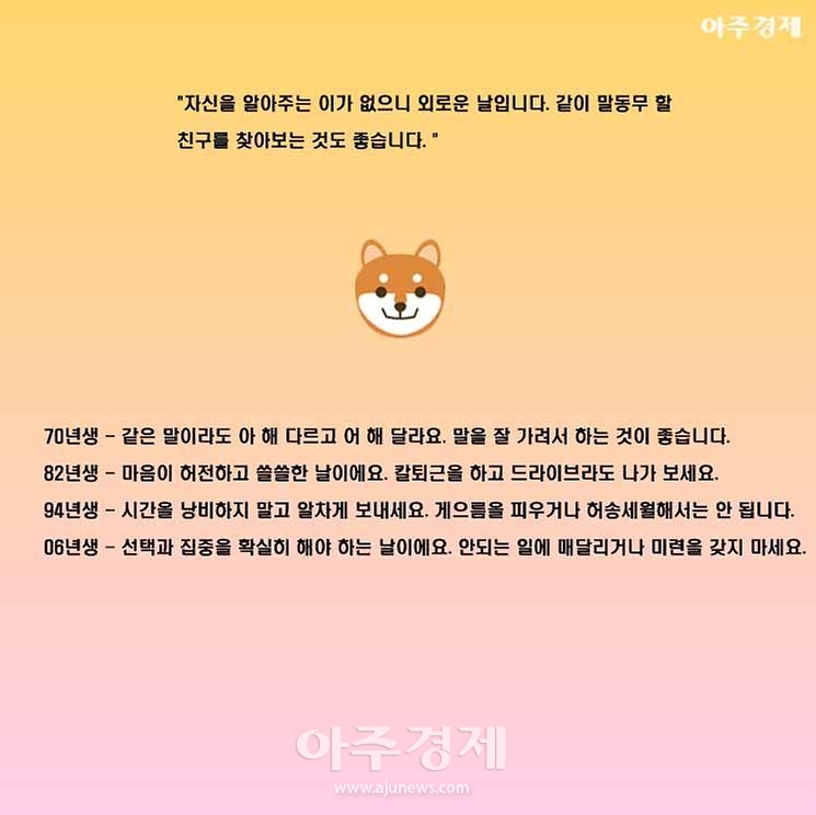 ▶개띠 오늘의 운세 "자신을 알아주는 이가 없으니 외로운 날입니다. 같이 말동무 할 친구를 찾아보는 것도 좋습니다. "