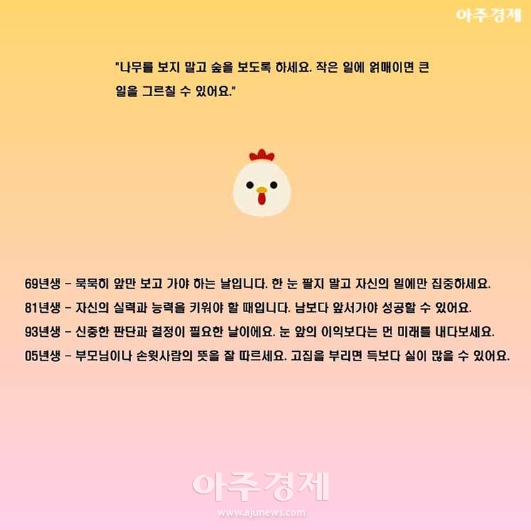 ▶닭띠 오늘의 운세 "나무를 보지 말고 숲을 보도록 하세요. 작은 일에 얽매이면 큰 일을 그르칠 수 있어요."