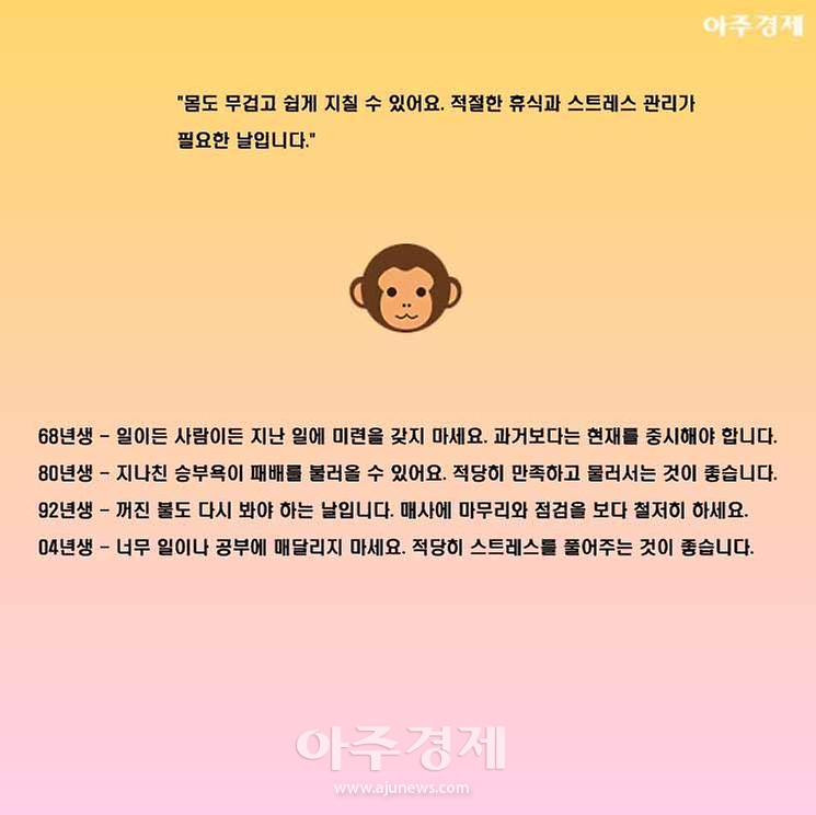 ▶원숭이띠 오늘의 운세 "몸도 무겁고 쉽게 지칠 수 있어요. 적절한 휴식과 스트레스 관리가 필요한 날입니다."
