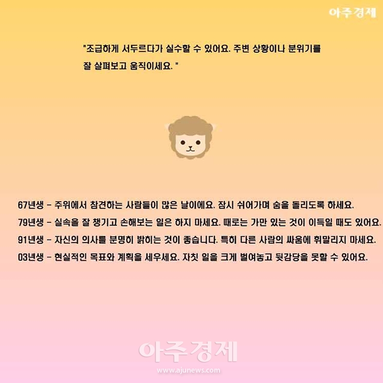 ▶양띠 오늘의 운세 "조급하게 서두르다가 실수할 수 있어요. 주변 상황이나 분위기를 잘 살펴보고 움직이세요. "