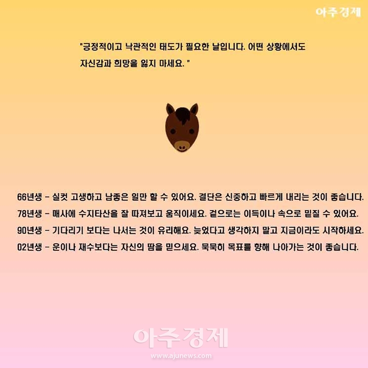 ▶말띠 오늘의 운세 "긍정적이고 낙관적인 태도가 필요한 날입니다. 어떤 상황에서도 자신감과 희망을 잃지 마세요. "