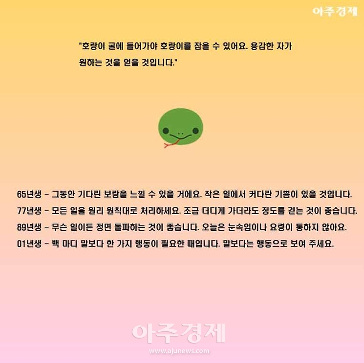 ▶뱀띠 오늘의 운세  "호랑이 굴에 들어가야 호랑이를 잡을 수 있어요. 용감한 자가 원하는 것을 얻을 것입니다."