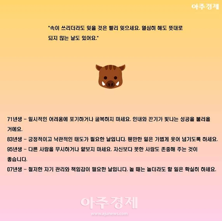 ▶돼지띠 오늘의 운세 "속이 쓰리더라도 잊을 것은 빨리 잊으세요. 열심히 해도 뜻대로 되지 않는 날도 있어요."