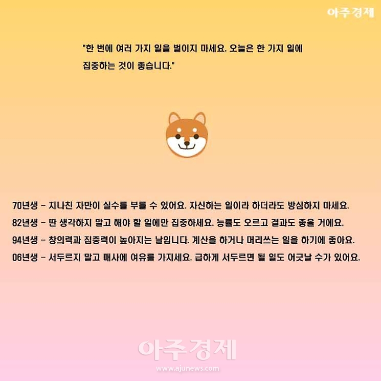 ▶개띠 오늘의 운세 "한 번에 여러 가지 일을 벌이지 마세요. 오늘은 한 가지 일에 집중하는 것이 좋습니다."