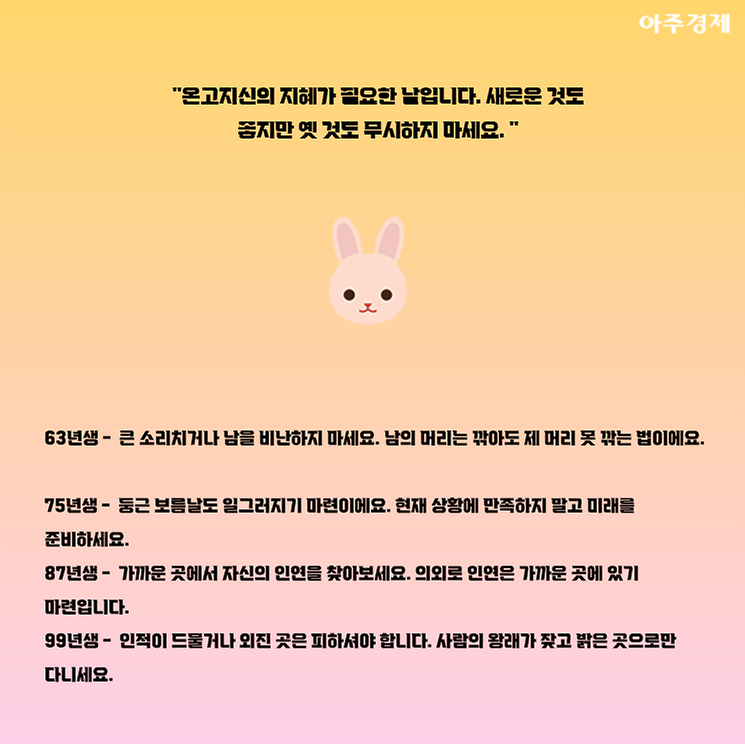 ▶토끼띠 오늘의 운세 "온고지신의 지혜가 필요한 날입니다. 새로운 것도 좋지만 옛 것도 무시하지 마세요. "