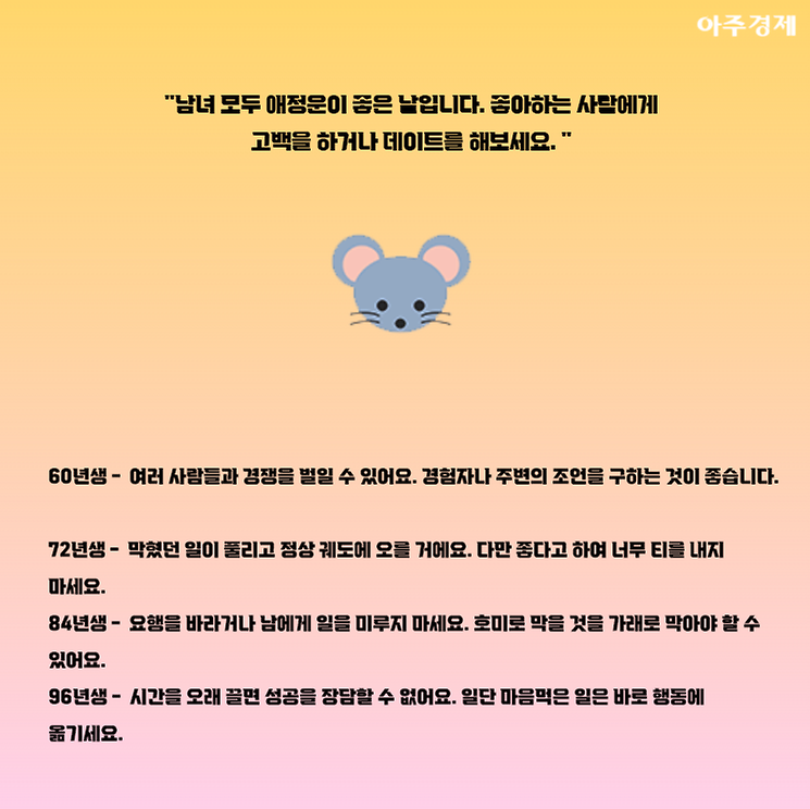 ▶쥐띠 오늘의 운세 "남녀 모두 애정운이 좋은 날입니다. 좋아하는 사람에게 고백을 하거나 데이트를 해보세요. "