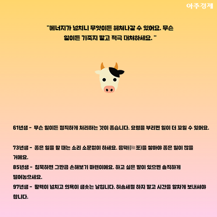 ▶소띠 오늘의 운세 "에너지가 넘치니 무엇이든 헤쳐나갈 수 있어요. 무슨 일이든 기죽지 말고 적극 대처하세요. "