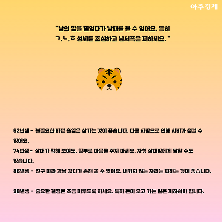 ▶호랑이띠 오늘의 운세 "남의 말을 믿었다가 낭패를 볼 수 있어요. 특히 ㄱ,ㄴ,ㅎ 성씨를 조심하고 남서쪽은 피하세요. "