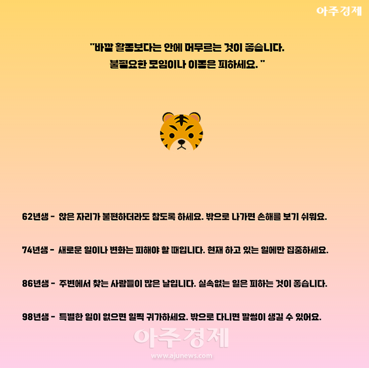 ▶호랑이띠 오늘의 운세 "바깥 활동보다는 안에 머무르는 것이 좋습니다. 불필요한 모임이나 이동은 피하세요. "