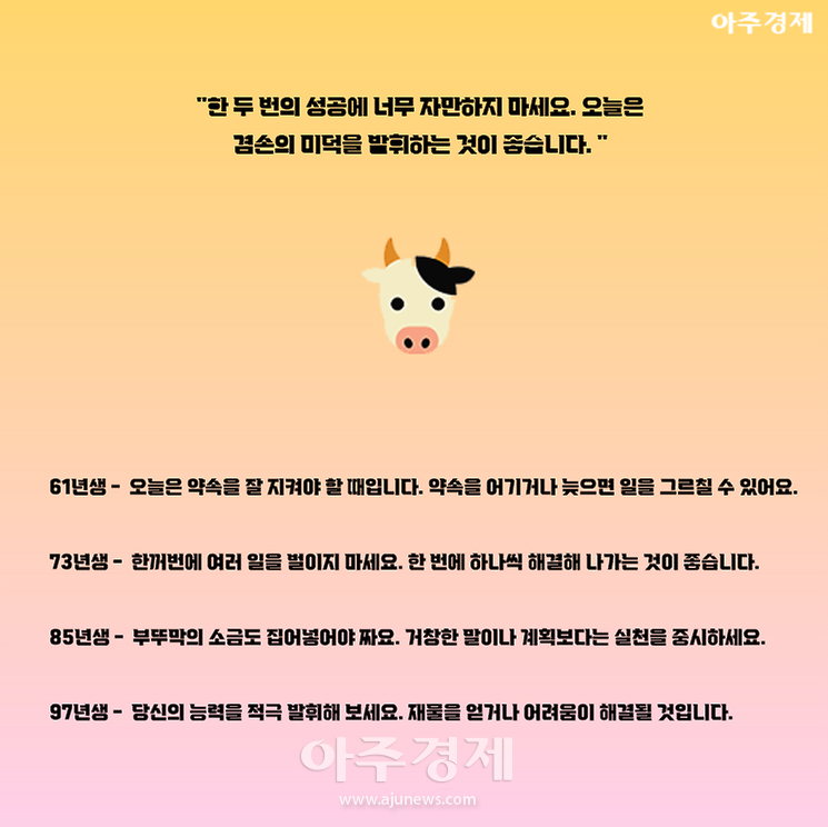 ▶소띠 오늘의 운세 "한 두 번의 성공에 너무 자만하지 마세요. 오늘은 겸손의 미덕을 발휘하는 것이 좋습니다. "