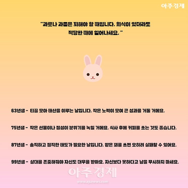 ▶토끼띠 오늘의 운세 "과로나 과음은 피해야 할 때입니다. 회식이 있더라도 적당한 때에 일어나세요. "