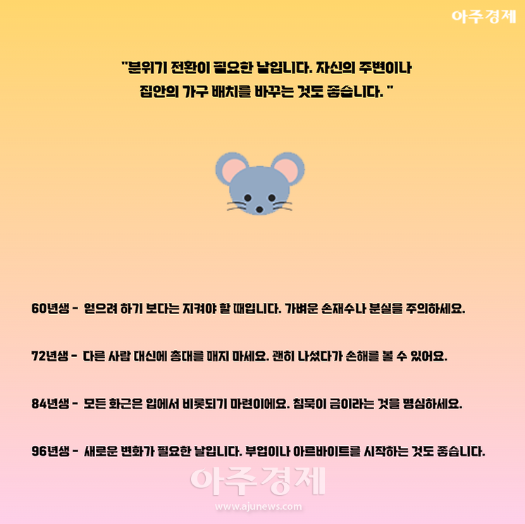 ▶쥐띠 오늘의 운세 "분위기 전환이 필요한 날입니다. 자신의 주변이나 집안의 가구 배치를 바꾸는 것도 좋습니다. "