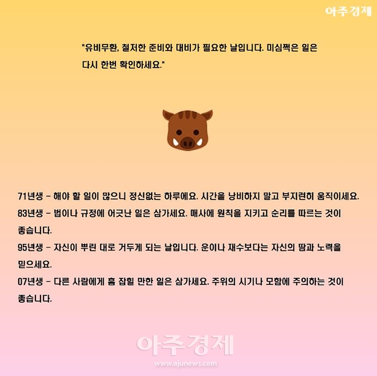 ▶돼지띠 오늘의 운세 "유비무환, 철저한 준비와 대비가 필요한 날입니다. 미심쩍은 일은 다시 한번 확인하세요."