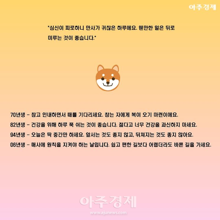 ▶개띠 오늘의 운세 "심신이 피로하니 만사가 귀찮은 하루에요. 웬만한 일은 뒤로 미루는 것이 좋습니다."