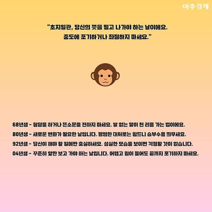 ▶원숭이띠 오늘의 운세 "초지일관, 당신의 뜻을 밀고 나가야 하는 날이에요. 중도에 포기하거나 좌절하지 마세요."