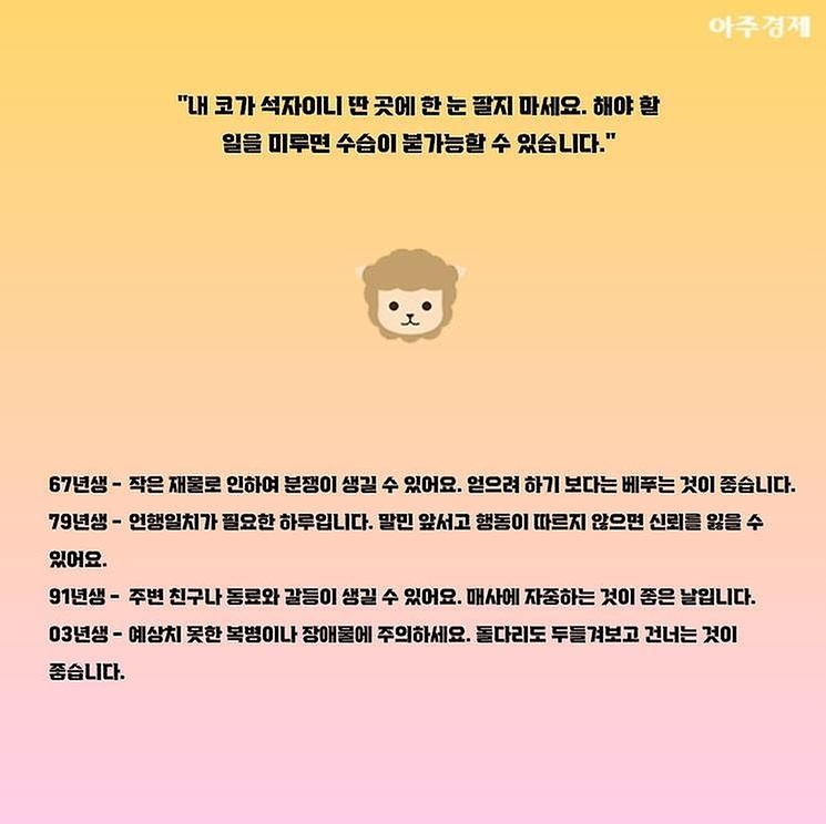 ▶양띠 오늘의 운세 "내 코가 석자이니 딴 곳에 한 눈 팔지 마세요. 해야 할 일을 미루면 수습이 불가능할 수 있습니다."