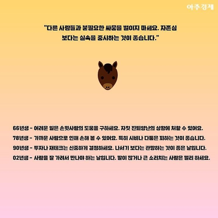 ▶말띠 오늘의 운세 "다른 사람들과 불필요한 싸움을 벌이지 마세요. 자존심 보다는 실속을 중시하는 것이 좋습니다."