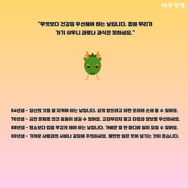 ▶용띠 오늘의 운세 "무엇보다 건강을 우선해야 하는 날입니다. 몸에 무리가 가기 쉬우니 과로나 과식은 피하세요."