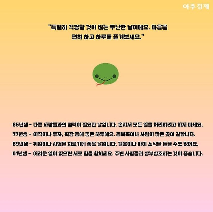▶뱀띠 오늘의 운세 "특별히 걱정할 것이 없는 무난한 날이에요. 마음을 편히 하고 하루를 즐겨보세요."