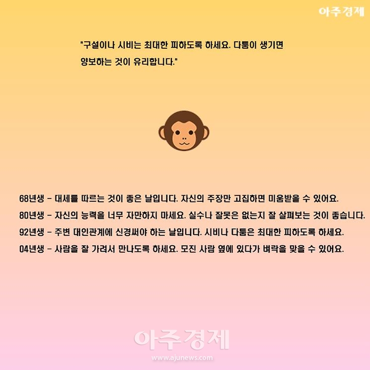 ▶원숭이띠 오늘의 운세 "구설이나 시비는 최대한 피하도록 하세요. 다툼이 생기면 양보하는 것이 유리합니다."