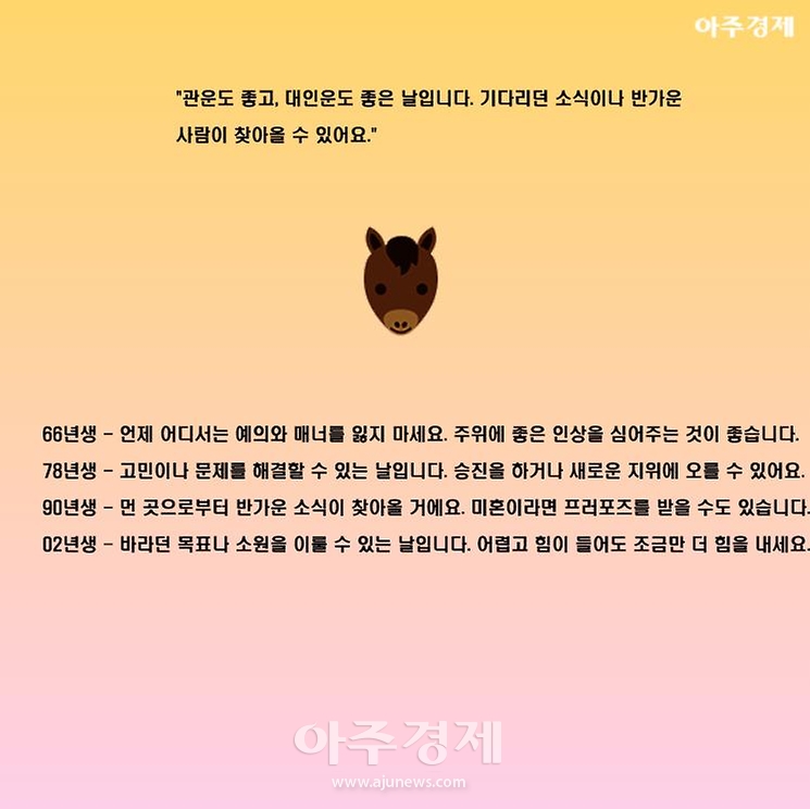 ▶말띠 오늘의 운세 "관운도 좋고, 대인운도 좋은 날입니다. 기다리던 소식이나 반가운 사람이 찾아올 수 있어요."