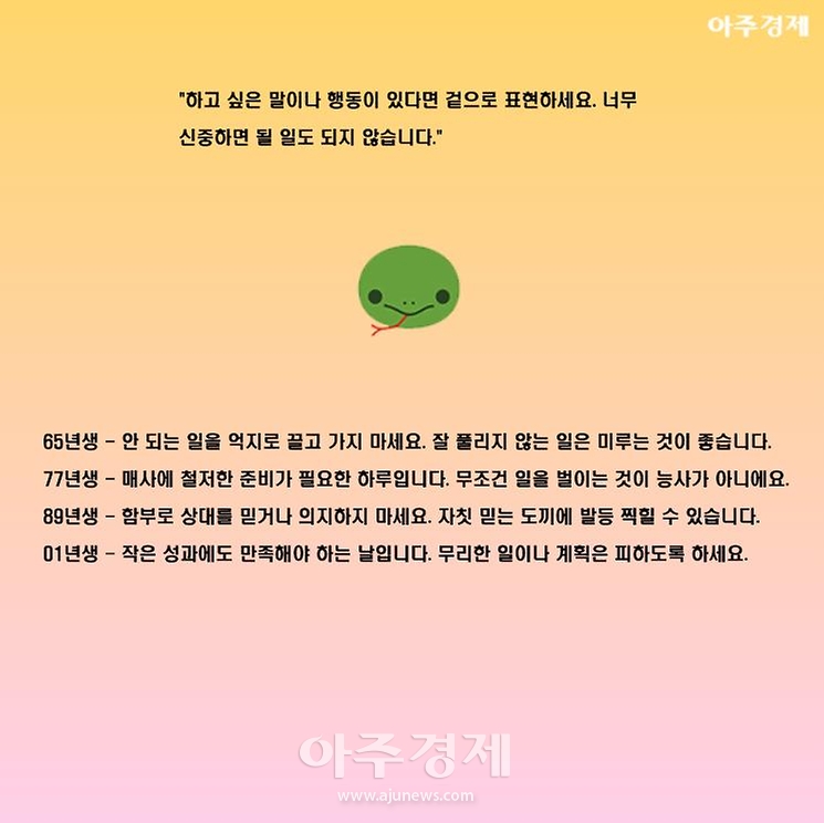 ▶뱀띠 오늘의 운세  "하고 싶은 말이나 행동이 있다면 겉으로 표현하세요. 너무 신중하면 될 일도 되지 않습니다."