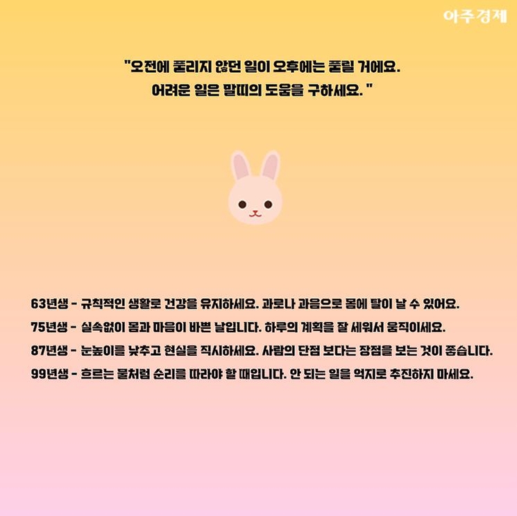 ▶토끼띠 오늘의 운세 "오전에 풀리지 않던 일이 오후에는 풀릴 거에요. 어려운 일은 말띠의 도움을 구하세요. "