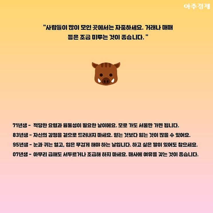 ▶돼지띠 오늘의 운세 "사람들이 많이 모인 곳에서는 자중하세요. 거래나 매매 등은 조금 미루는 것이 좋습니다. "