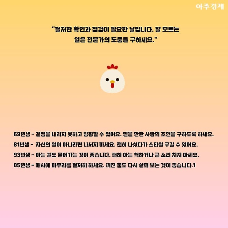 ▶닭띠 오늘의 운세 "철저한 확인과 점검이 필요한 날입니다. 잘 모르는 일은 전문가의 도움을 구하세요."