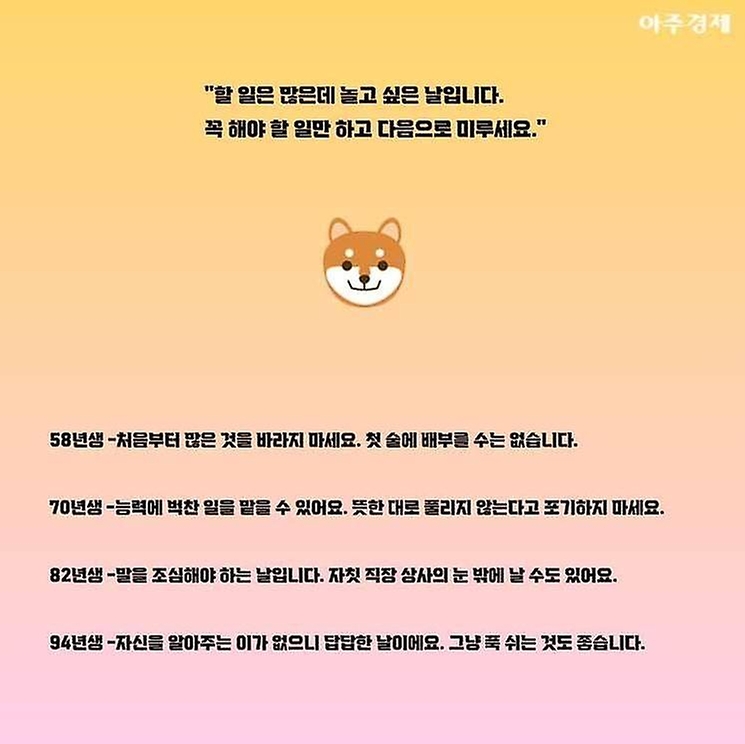 ▶개띠 오늘의 운세 "할 일은 많은데 놀고 싶은 날입니다. 꼭 해야 할 일만 하고 다음으로 미루세요."