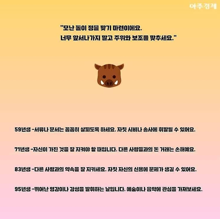 ▶돼지띠 오늘의 운세 "모난 돌이 정을 맞기 마련이에요. 너무 앞서나가지 말고 주위와 보조를 맞추세요."