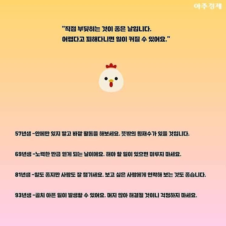 ▶닭띠 오늘의 운세 "직접 부딪히는 것이 좋은 날입니다. 어렵다고 피해다니면 일이 커질 수 있어요."