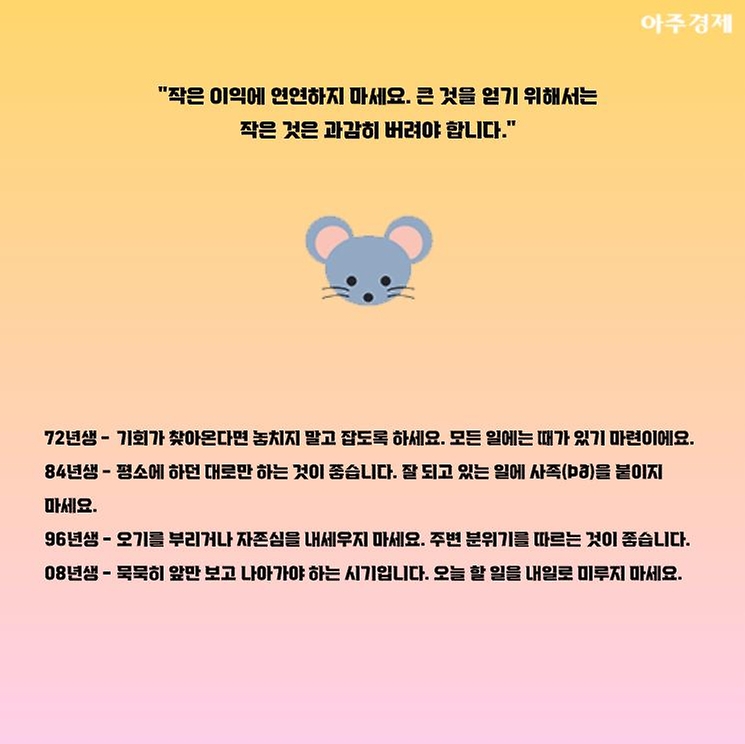 ▶쥐띠 오늘의 운세 "작은 이익에 연연하지 마세요. 큰 것을 얻기 위해서는 작은 것은 과감히 버려야 합니다."