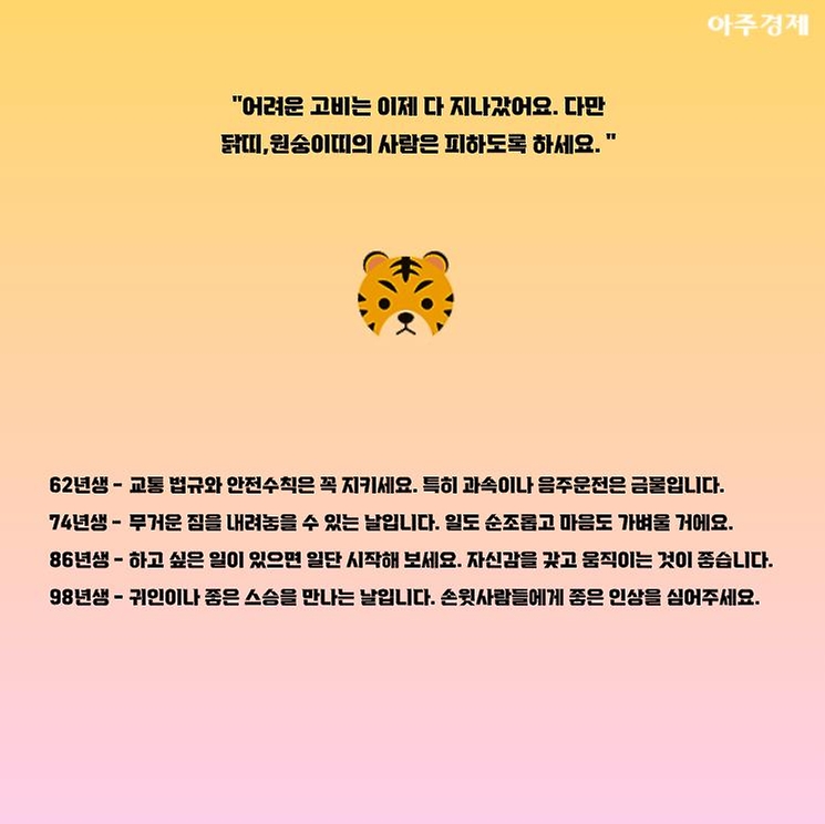 ▶호랑이띠 오늘의 운세 "어려운 고비는 이제 다 지나갔어요. 다만 닭띠,원숭이띠의 사람은 피하도록 하세요. "