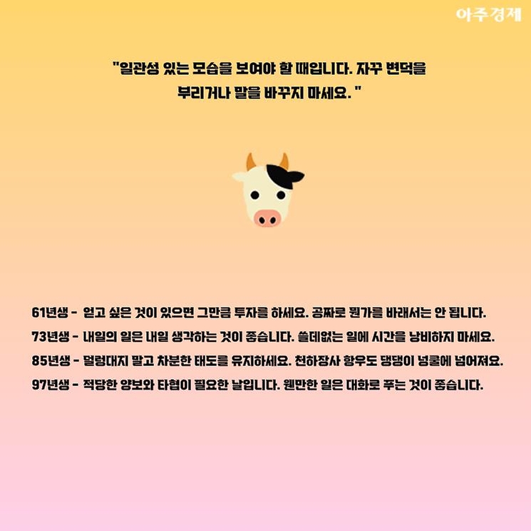 ▶소띠 오늘의 운세 "일관성 있는 모습을 보여야 할 때입니다. 자꾸 변덕을 부리거나 말을 바꾸지 마세요. "