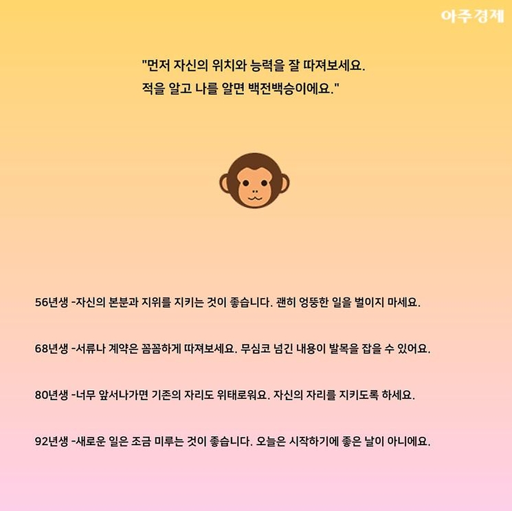 ▶원숭이띠 오늘의 운세 "먼저 자신의 위치와 능력을 잘 따져보세요. 적을 알고 나를 알면 백전백승이에요. "