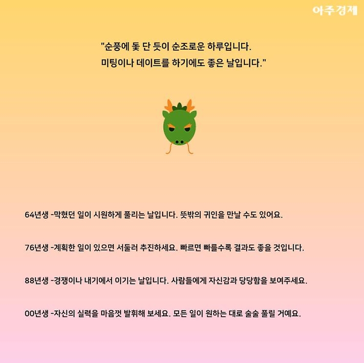 ▶용띠 오늘의 운세 "순풍에 돛 단 듯이 순조로운 하루입니다. 미팅이나 데이트를 하기에도 좋은 날입니다."