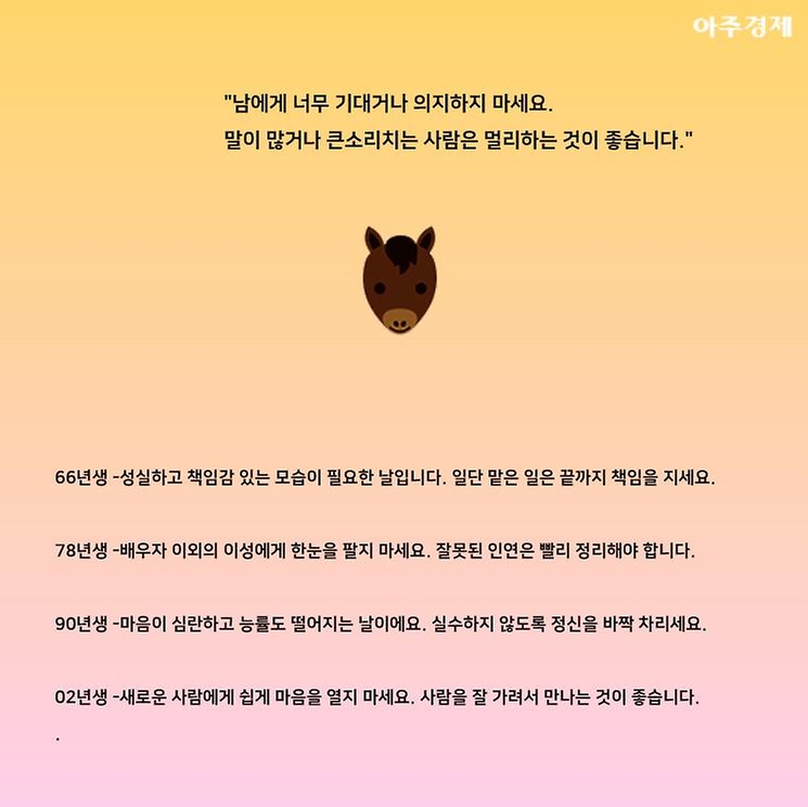 ▶말띠 오늘의 운세 "남에게 너무 기대거나 의지하지 마세요. 말이 많거나 큰 소리치는 사람은 멀리 하는 것이 좋습니다."