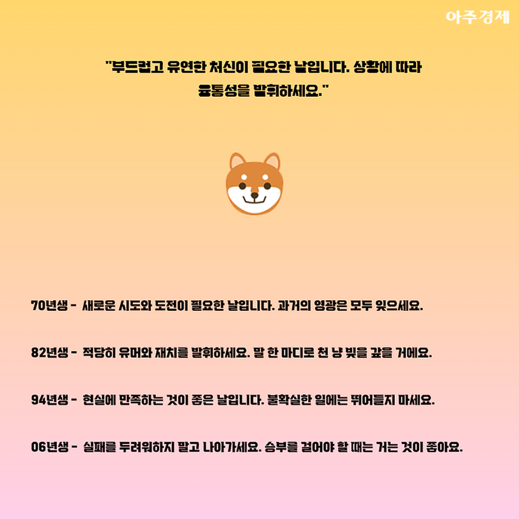 ▶개띠 오늘의 운세 "부드럽고 유연한 처신이 필요한 날입니다. 상황에 따라 융통성을 발휘하세요."