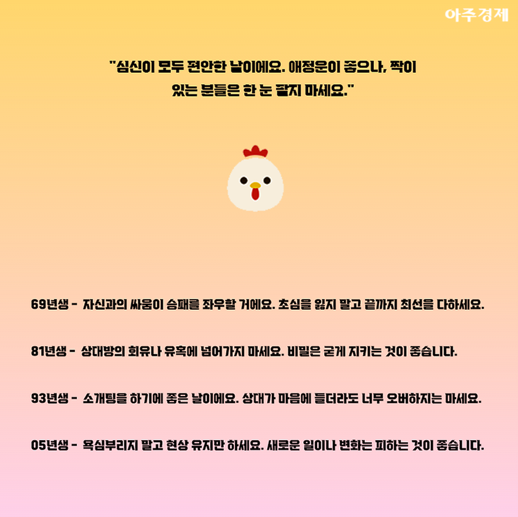 ▶닭띠 오늘의 운세 "심신이 모두 편안한 날이에요. 애정운이 좋으나, 짝이 있는 분들은 한 눈 팔지 마세요."