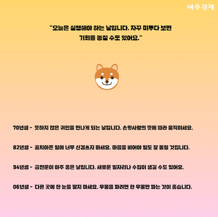 ▶개띠 오늘의 운세 "오늘은 실행해야 하는 날입니다. 자꾸 미루다 보면 기회를 놓칠 수도 있어요."