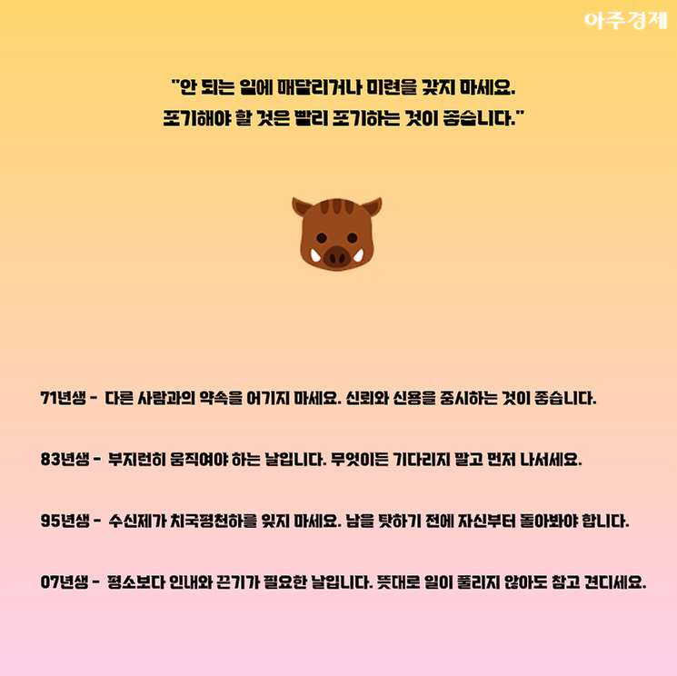 ▶돼지띠 오늘의 운세 "안 되는 일에 매달리거나 미련을 갖지 마세요. 포기해야 할 것은 빨리 포기하는 것이 좋습니다."