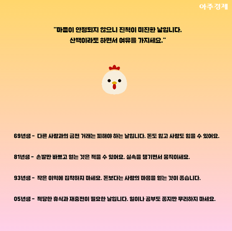 ▶닭띠 오늘의 운세 "마음이 안정되지 않으니 진척이 미진한 날입니다. 산책이라도 하면서 여유를 가지세요."