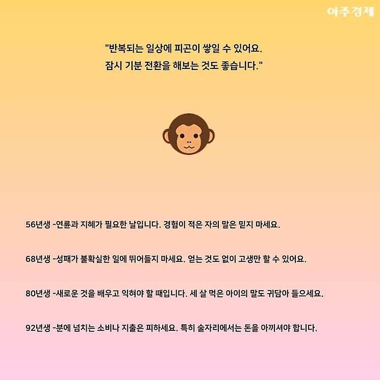 ▶원숭이띠 오늘의 운세 "반복되는 일상에 피곤가 쌓일 수 있어요. 잠시 기분 전환을 해보는 것도 좋습니다."