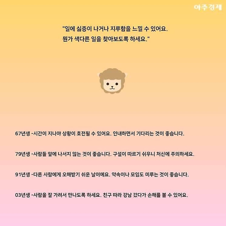 ▶양띠 오늘의 운세 "일에 싫증이 나거나 지루함을 느낄 수 있어요. 뭔가 색다른 일을 찾아보도록 하세요."